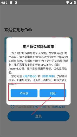 在使用【乐Talk】之前,请务必阅读【用户协议】与【隐私政策】,并点击弹窗里的【同意】按钮,以便进入后续操作流程。