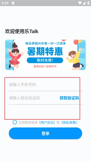 进入【乐Talk】的登录页面后,首先在【请输入手机号码】的输入框中填写号码,接着点击【获取验证码】按钮,待收到验证码后将其填入【请输入短信验证码】的输入框,最后点击【登录】按钮即可完成登录操作。
