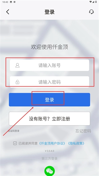 进入登录界面后,在对应的输入框中分别填写“请输入账号”和“请输入密码”,确认勾选相关协议后,点击“登录”按钮即可。