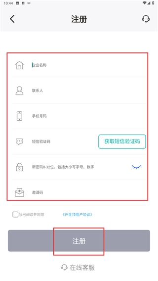 进入注册页面后,按顺序填写【企业名称】【联系人】【手机号码】等信息,设置好密码后点击【注册】按钮,即可完成账号的创建。