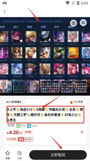 4、每个账号都配有详细的亮度说明,还附带截图作为佐证,要是感兴趣,直接点击右下角的“立即租玩”按钮就行。