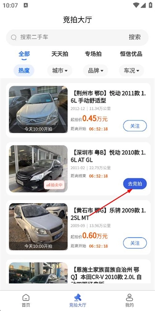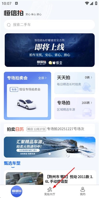 在恒信拍首页点击底部的竞拍大厅选项,即可进入竞拍车辆列表页面。
