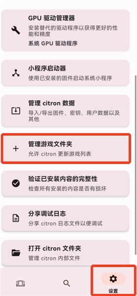 之后打开软件,点击右下方的设置选项,向下滑动找到【管理游戏文件夹】,进入该页面后,点击右下角的【+】号按钮。