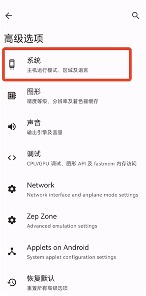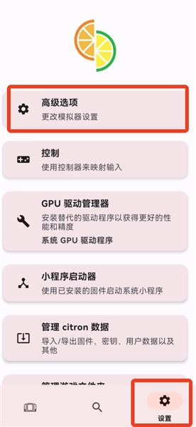 在软件的【设置】界面中,点击第一个【高级选项】,该选项内支持对模拟器的各项参数进行调整。