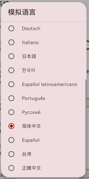 之后再点击【模拟语言】选项,将【English】切换为【简体中文】。完成这一步设置后,大部分游戏启动后就会显示中文界面了。