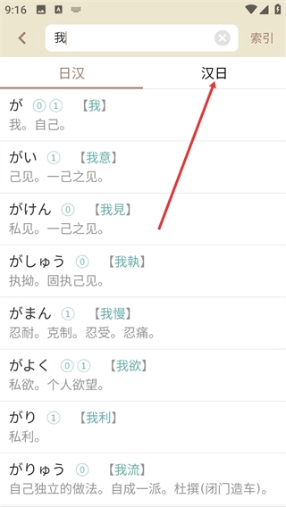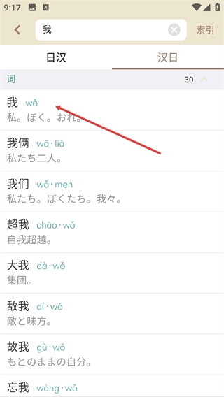 点击搜索框输入关键词(例如“我”),就能查询到对应的日汉、汉日翻译内容,这款词典整合了新日汉和新汉日辞书的功能。
