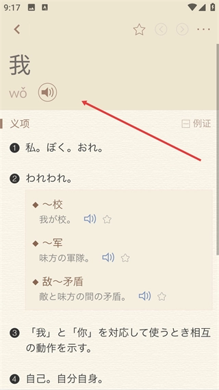 点击具体词汇(例如“我”)进入详情页面,就能查看该词汇的发音(点击喇叭图标播放)、多个义项的详细解释以及搭配使用的示例,从而帮助理解词汇在实际场景中的运用方式。