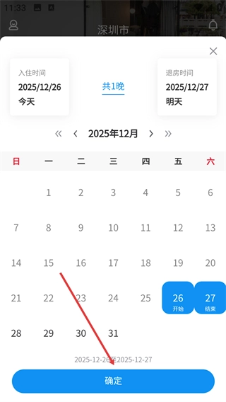 在日期选择界面,你可以通过日历挑选入住日期(例如2025年12月26日)和退房日期(例如2025年12月27日),点击【确定】按钮后,就能完成时间的设置。