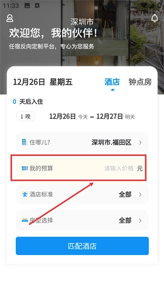 回到预订页面后,点击【我的预算】输入框,就能填写期望的价格(例如1000元),还可以调整【酒店标准】【房型选择】等筛选条件。