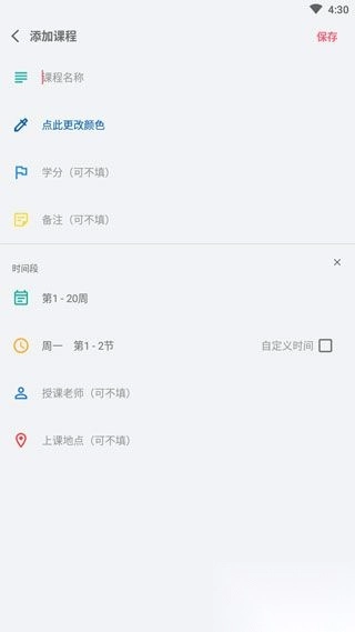 2、点击右上角的“+”按钮,可手动添加课程,填写完毕后请记得保存。