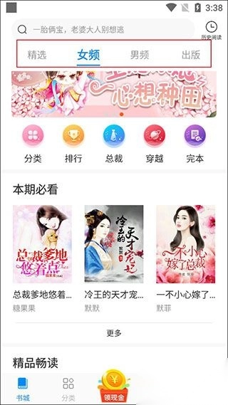 1、进入洋葱小说免费阅读软件的主界面后,你可以选择精选、女频、男频或者出版类小说进行阅读,同时也能看到本期必看、精品畅读等板块。