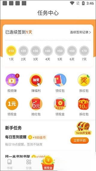 7、每天签到都能领取福利,阅读书籍可以赚取金币,参加活动还能申请提现,让看书这件事更有成就感。