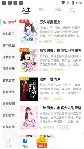 2、切换至下方的分类栏,此时能看到热门榜单、穿越重生、豪门总裁、现代言情等类别。
