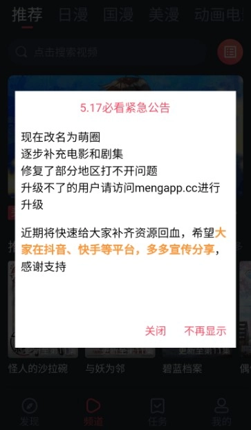 打开软件后,首先映入眼帘的公告显示它已经改名为萌圈了,并且还更新了内容。