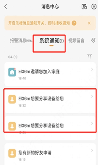 之后会出现等待对方同意的提示,对方需要登录乐橙APP,进入消息页面找到系统通知,点击接受就可以了。