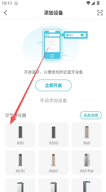 请选择你正在使用的空气净化器或智能净水机品牌,然后开始连接设备。