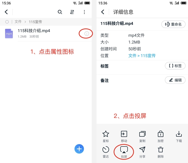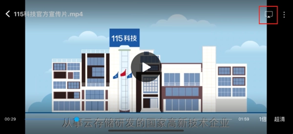 在手机上打开115网盘,找到想要投屏的文件或文件夹,点击“属性”按钮里的“投屏”图标。