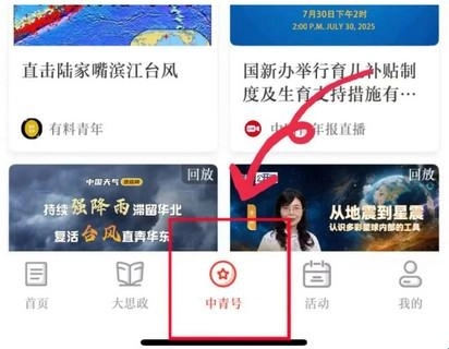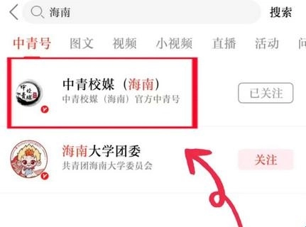 打开“中国青年报”,找到底部菜单栏的“中青号”频道并进入,接着点击左上角的“搜索”放大镜图标,在弹出的搜索框中精准输入“中青校媒(海南)”。