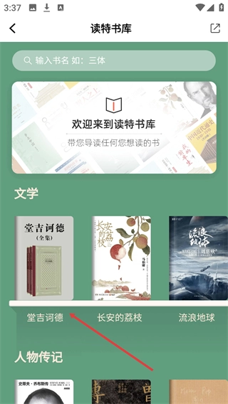 在【读特书库】页面,能看到【文学】等分类下的书籍,像【堂吉诃德】,点击相应书籍就能查看详情。