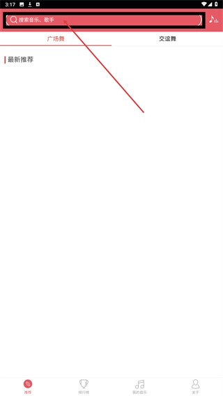 在推荐页面顶部的搜索框中,输入音乐或歌手名称,即可搜索到对应的资源;此外,还能切换【广场舞】【交谊舞】分类来浏览相关内容。