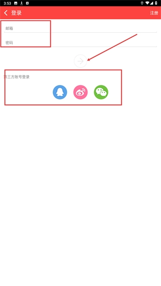 在登录界面,用户既可以输入【邮箱】和【密码】完成账号登录操作,也能够通过选择【第三方账号登录】板块下的相应平台实现快捷登录。