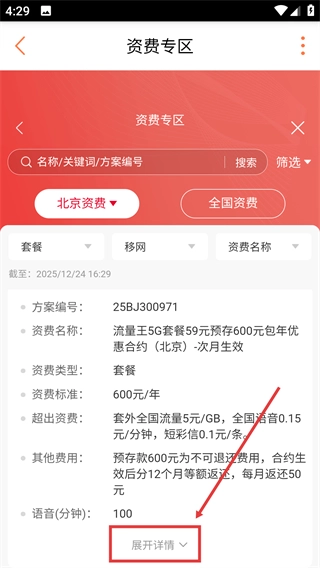 在资费专区页面,您可以通过选择具体地区(例如北京资费)来筛选该区域对应的套餐,点击【展开详情】按钮即可查看套餐的全部资费信息。