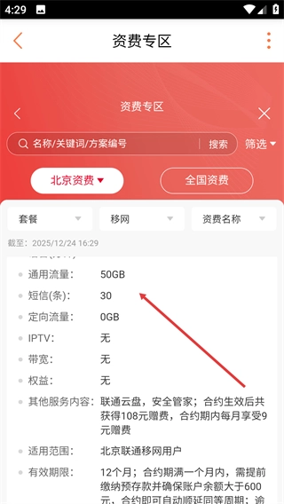 展开详情后,能够查看套餐包含的通用流量、短信条数等具体信息,从而全面了解该资费方案所涵盖的服务内容及相关规则。