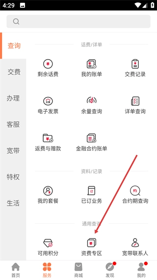 在服务页面的通用查询区域,点击【资费专区】就能进入资费信息查询界面,查看各类套餐的资费详情。