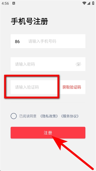 在“请输入验证码”的输入框中填写验证码,接着点击注册按钮,即可完成账号的注册流程。
