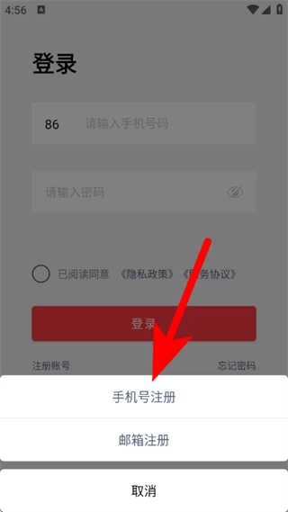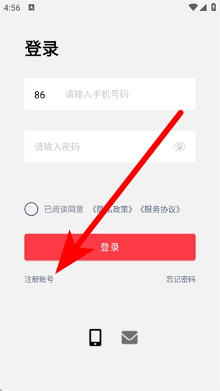 打开红树河熊应用,进入登录页面后,点击“注册账号”选项,此时会弹出注册方式的选择界面。