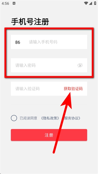 在手机号注册界面,填写手机号码、设置登录密码后,点击“获取验证码”按钮。