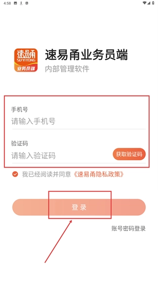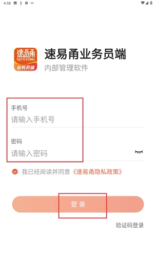 在【速易甬业务员端】的登录页面,先在【请输入手机号】的输入框中填写手机号,接着获取验证码并填入对应的验证码框,之后勾选相关协议,最后点击【登录】按钮,即可完成验证流程。