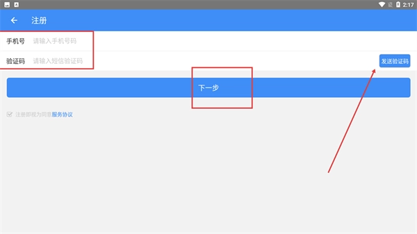 在注册页面,首先输入手机号码(对应输入框提示文字为“请输入手机号码”),接着点击“发送验证码”按钮以获取短信验证码,待验证码填写完毕后,点击“下一步”按钮继续完成注册流程。