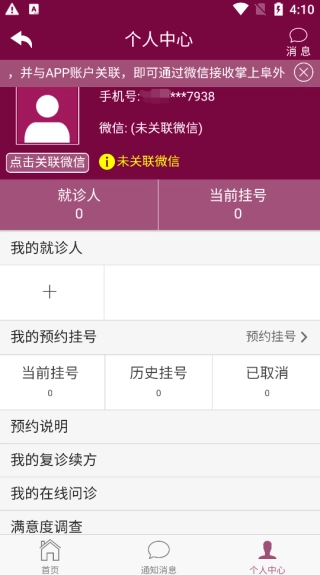 注册完成后系统会自动登录,此时我们就可以点击“我的就诊人”选项,补充个人信息了。