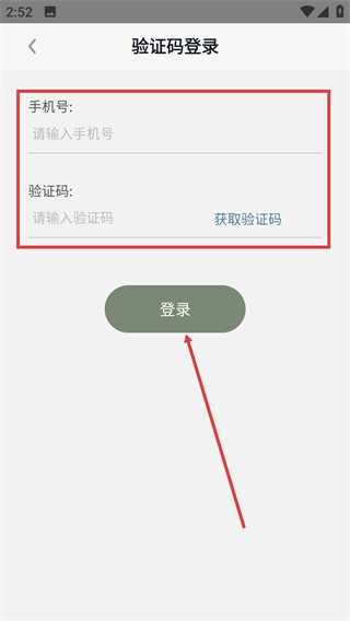 在验证码登录页面,先输入手机号,接着点击【获取验证码】按钮,然后填写收到的验证码,最后点击【登录】按钮,就能完成账号验证并进入系统。
