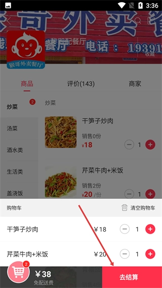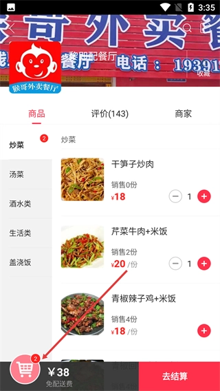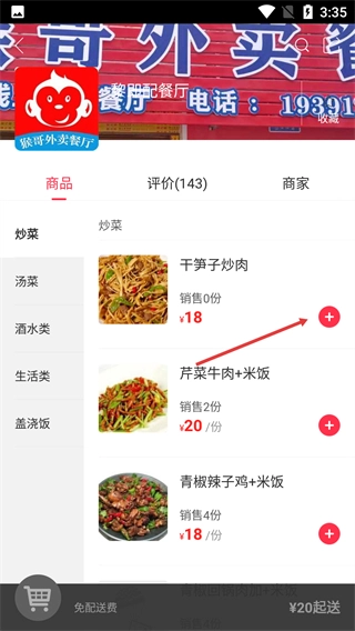 在餐厅的商品页面,点击菜品右边的【+】按钮,就能把该菜品添加到购物车,还可以选择多种菜品来点餐。