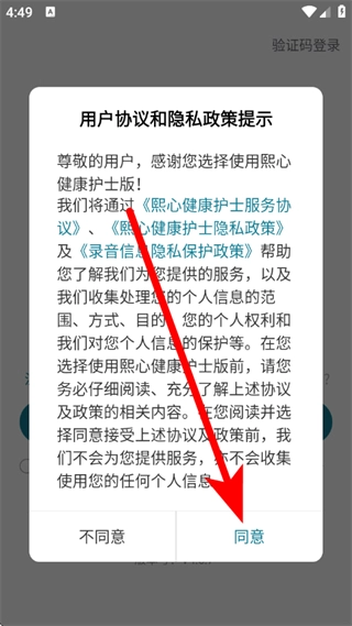 打开熙心健康护士版应用,在弹出的窗口中点击“同意”按钮,随后进入密码登录界面。