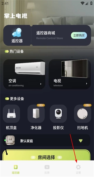 打开软件后,进入遥控器界面,能看到热门设备等分类板块,接着找到页面底部的设置选项,点击该选项即可进入设置相关页面。