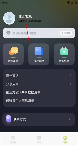 进入设置界面后,能看到注册登录的提示信息以及各类功能的入口,此时选择注册登录的选项,即可进入到与用户登录相关的界面。