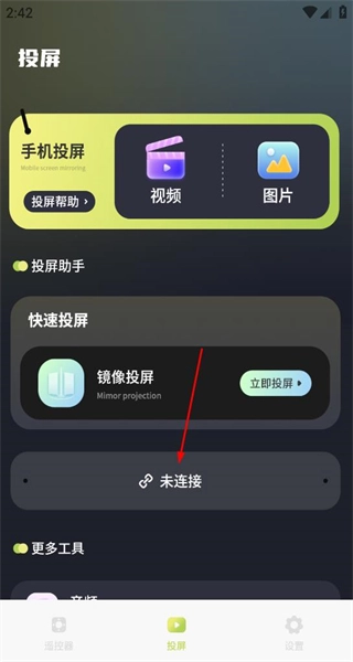 登录完成后返回主界面,接着选择投屏选项进入对应的投屏页面,在该页面中找到镜像投屏功能,点击此功能就能为投屏连接做好准备。