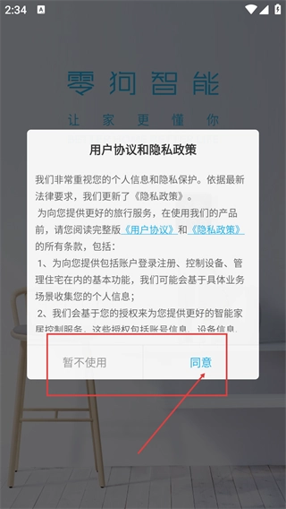 在使用零狗智能之前,请您务必仔细阅读《用户协议》和《隐私政策》,充分了解相关信息处理规则。在确认理解并同意上述内容后,您可以点击“同意”按钮,进而进入后续的操作流程。