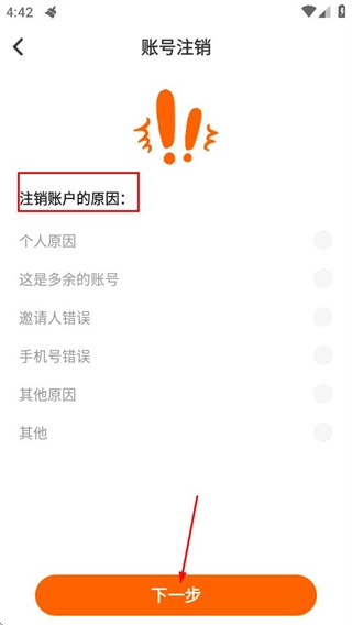在账号注销流程中,当进入注销原因选择页面后,用户选定具体原因并点击“下一步”按钮,系统将跳转至账号注销验证环节。