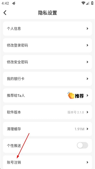 在隐私设置页面,点击账号注销选项,就能进入账号注销原因选择页面。