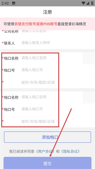 完成所有信息(包括多个档口)的填写后,勾选协议并点击【提交】按钮,就能完成账号注册,之后可以用这个账号登录系统。