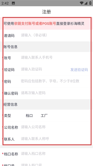 在注册页面,需要填写邀请码(非必填项)、账号相关信息(包括手机号、验证码和密码),以及经营方面的信息(如类型、公司名称等内容),以此完成基础信息的录入工作。