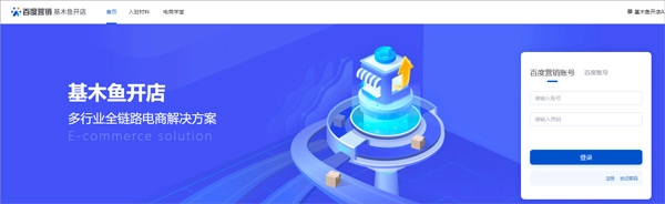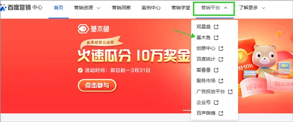 账号注册成功后,即可申请入驻百度惠生活。考虑到手机端操作不太方便,建议用户通过电脑端进行操作:在电脑浏览器中输入链接https://yingxiao.baidu.com/home,进入百度营销页面;随后点击顶部导航栏里的【营销平台】(即下图绿色方框标注的区域),在弹出的下拉菜单中选择【基木鱼】即可。
