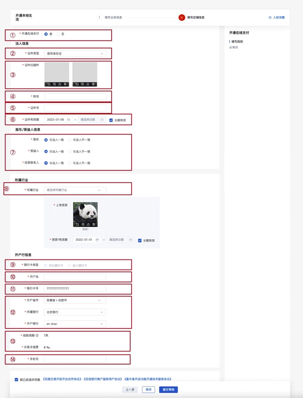 此部分需填写“商户信息”与“店铺信息”两项内容;单个账户仅能对应一组商户信息,而一个商户名下可关联多家店铺,这类似于分店的模式。举例来说:若商户名称为“百度集团”,那么店铺名称可以设置为“百度总部”“百度北京”“百度上海”等。