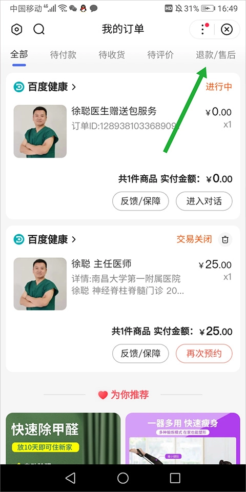 在打开的我的订单页面里,点击顶部导航栏中的【退款/售后】选项(即下图绿色箭头所指向的位置)