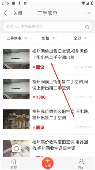 在二手家电的列表里,能看到像福州闽侯出售旧空调这类信息,价格标注为面议,点击对应的信息就能查看详情。