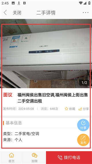 进入【福州闽侯出售旧空调】的二手详情页面,就能看到物品图片、发布时间等相关信息,点击页面底部的【拨打电话】按钮,即可联系到卖家。